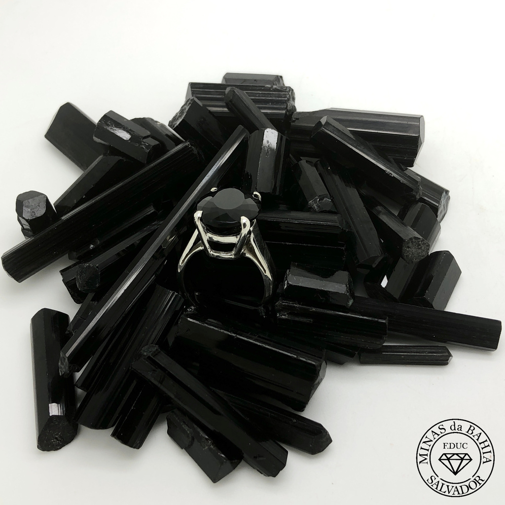 A turmalina negra usada nas nossas joias não é a comum vista embaixo do anel, é o nucleo brilhando do segundo canudo, muito mais densa, dura, rara e valorizada.